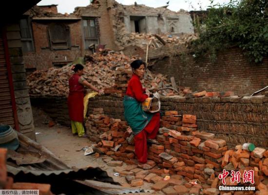 当地时间2015年5月15日,尼泊尔加德满都,尼泊尔民众在地震造成的废墟上进行清理工作。