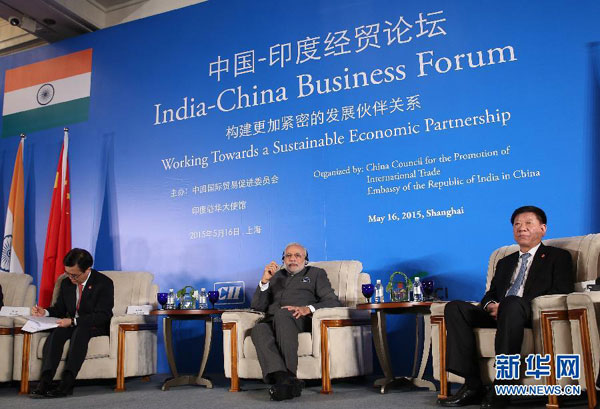 5月16日,莫迪出席“中国—印度经贸论坛”。当日,印度总理莫迪在上海访问。 新华社记者 裴鑫 摄