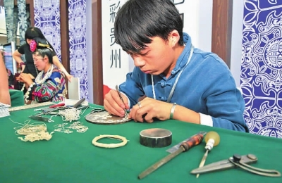 在深圳文博会现场,贵州苗族青年艺人制作银饰。资料照片