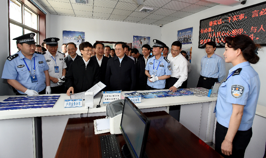 5月13日至15日,中共中央政治局委员、中央政法委书记孟建柱先后到大同、忻州、太原等地就经济发展新常态下政法综治工作进行调研。图为孟建柱在忻州市公安局调研。