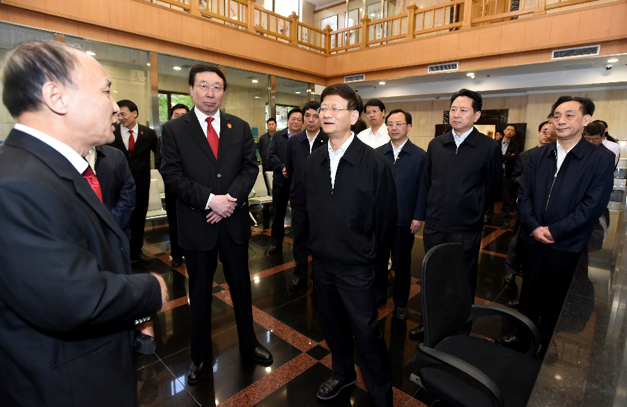 5月13日至15日,中共中央政治局委员、中央政法委书记孟建柱先后到大同、忻州、太原等地就经济发展新常态下政法综治工作进行调研。图为孟建柱在山西省高级人民法院诉讼服务中心调研。