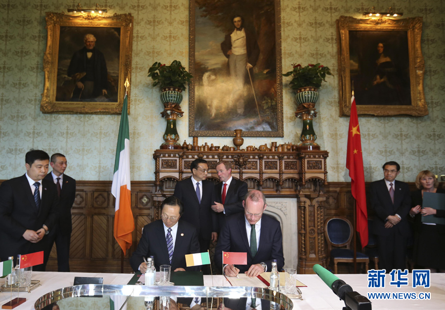当地时间5月17日下午,中国国务院总理李克强在香农同爱尔兰总理肯尼举行会谈。这是会谈后,两国总理共同见证双方便利人员往来、农业等领域合作文件的签署。 新华社记者丁林摄