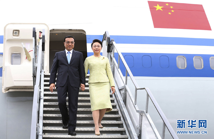当地时间5月17日下午,中国国务院总理李克强在前往巴西进行正式访问途中,在爱尔兰香农技术经停,并对爱尔兰进行过境访问。李克强和夫人程虹乘专机抵达香农机场时,爱尔兰政府代表财政部长等高级官员和中国驻爱尔兰大使徐建国到机场迎接。这是李克强和夫人程虹步下舷梯。 新华社记者黄敬文摄
