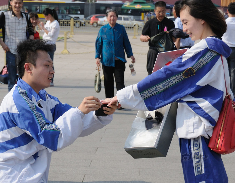 2015年05月16日,北京,一对情侣身穿酷似“校服”的服饰在天安门广场游览,男青年突然跪地向女友求婚,并为其佩戴准备好的戒指,引得过往游客纷纷驻足观看拍照,同时为他们祝福。