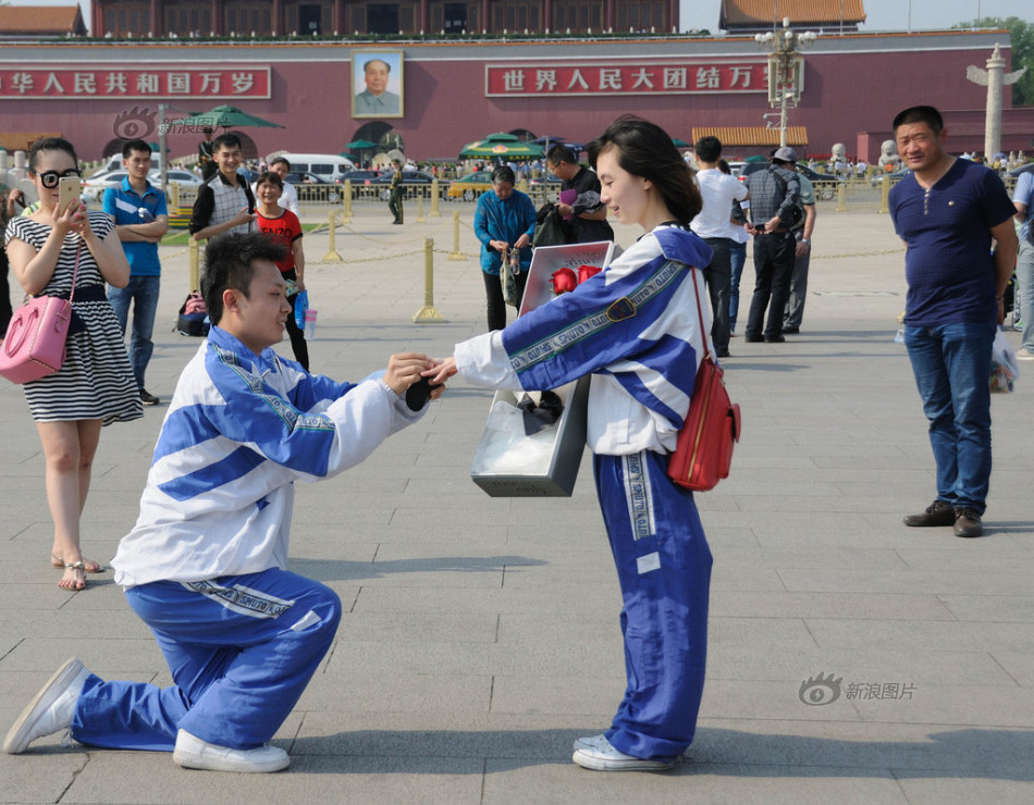 2015年05月16日,北京,一对情侣身穿酷似“校服”的服饰在天安门广场游览,男青年突然跪地向女友求婚,并为其佩戴准备好的戒指,引得过往游客纷纷驻足观看拍照,同时为他们祝福。
