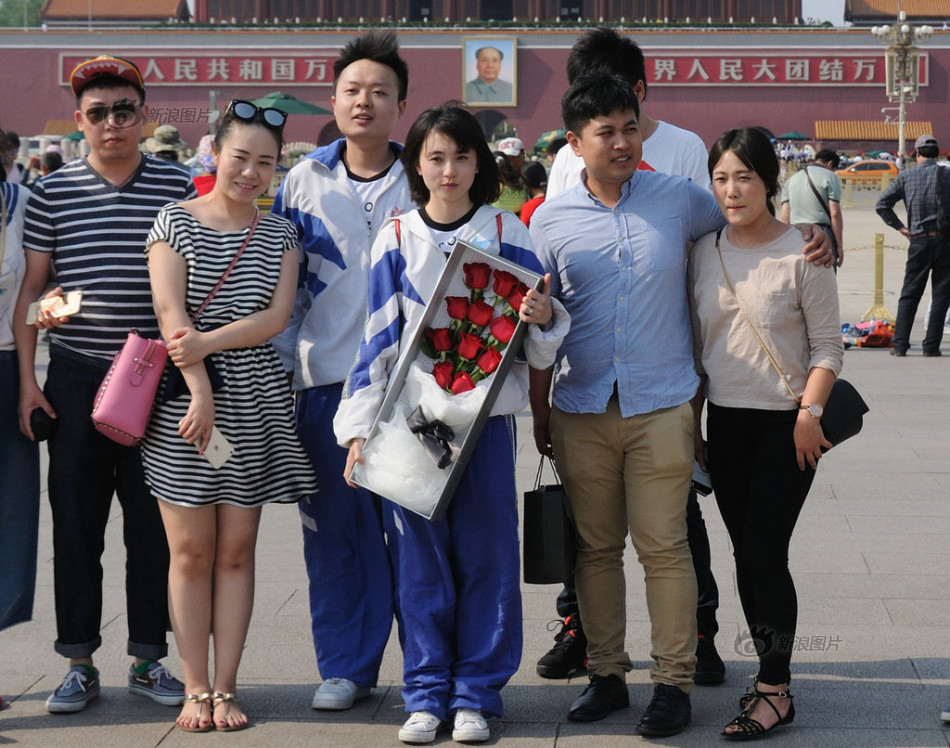 2015年05月16日,北京,一对情侣身穿酷似“校服”的服饰在天安门广场游览,男青年突然跪地向女友求婚,并为其佩戴准备好的戒指,引得过往游客纷纷驻足观看拍照,同时为他们祝福。