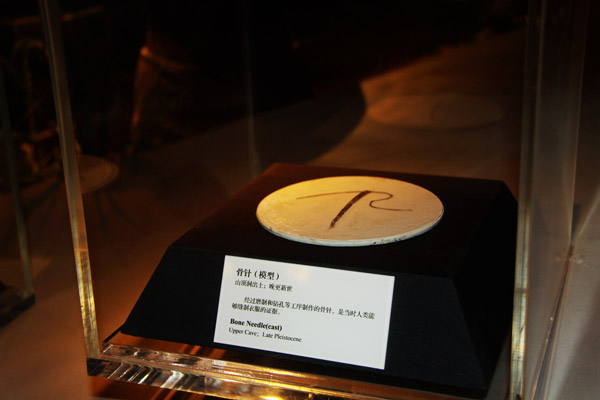 这是1933年发现于山顶洞第一文化层的骨针,针身略弯,毫无残损,针身圆滑,为刮削和磨制而成。骨针的发现说明当时的人类已经学会用树叶和兽皮之类的原料缝制衣服抵御寒冷了。