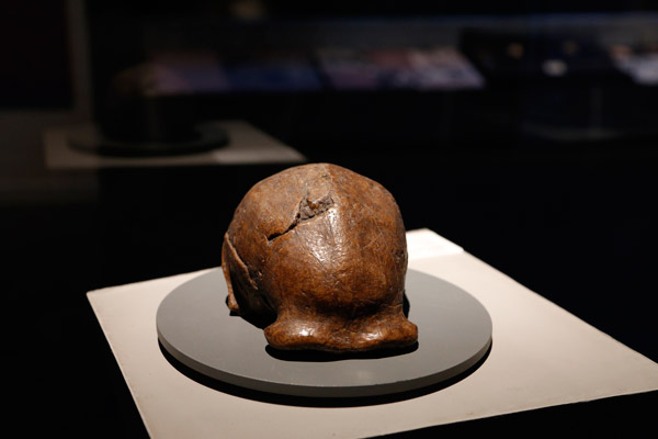 馆藏的第一颗“北京人”头盖骨化石模型。这是1929年12月2日裴文中在周口店第1地点主持发掘出土的第一颗“北京人”头盖骨,1941年原件失踪,此为模型,根据当时原件复原而成。头骨属于一个八、九岁的儿童。
