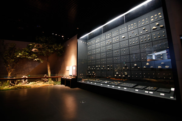 这是在第二展厅的石器墙。周口店遗址中发现了大量的石器,总数近10万件。博物馆采用矩阵式密集展示的手段,打造了一幅巨大的石器墙,展出的是“北京人”时期打造的石砧、石锤、砍砸器、刮削器、尖状器、雕刻器、石锥等石器及石制品共计484件。制造石器的原料有脉石英、砂岩、燧石等,大多采自附近的河床和山坡。这一时期,“北京人”已经能使用不同的技术制造多种类型的石器,砸击法、锤击法和碰砧法是最常用的三种技法。