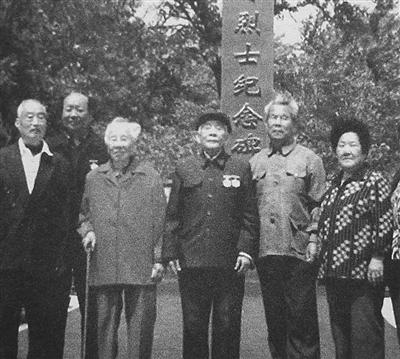 2006年5月19日,孙新民(右三)与王吉善营长的老伴刘新民(右四)、陈新庄血战时陈家大院的房东陈端杰(右二)在烈士纪念碑前合影。