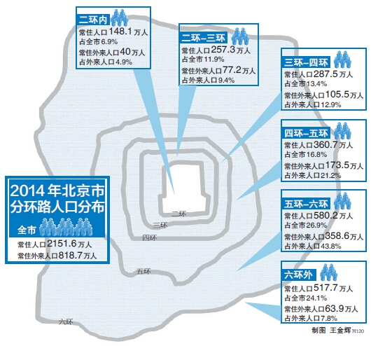 从环路上看,环路人口分布呈圈层向外拓展,即由二三环内向四环外聚集。2014年人口抽样调查结果显示,三环至六环间,聚集了1228.4万人的常住人口,占全市的57.1%;四环至六环间聚集了941万人,占全市的43.8%;五环以外1098万人,占全市的51.1%。