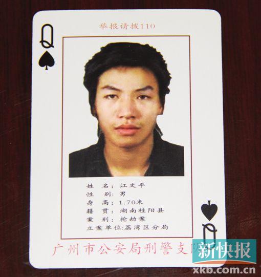 江文平是广州警方自2012年4月发布“扑克通缉令”以来,第14名落网的逃犯,也是在广州警方的“3+2”专项打击整治行动中,第一个落网的“扑克通缉令”逃犯。