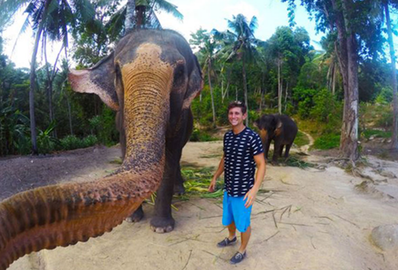 拿起相机自拍已经成为许多人日常生活的规定动作,旅游也不例外。近日,22岁的加拿大游客克里斯蒂安·勒布朗(Christian LeBlanc)在泰国旅行时的自拍照无疑羡煞旁人。据英国《镜报》5月19日报道,来自加拿大温哥华的克里斯蒂安·勒布朗前段时间在泰国帕岸岛(Koh Phangan)游玩,在喂一只大象香蕉时,被这只大象抢走了他的运动相机。结果戏剧性的一幕发生了:大象用鼻子卷起相机,将自己和身旁的勒布朗一同拍摄了下来,无意间已成为动物界的“自拍大师”。