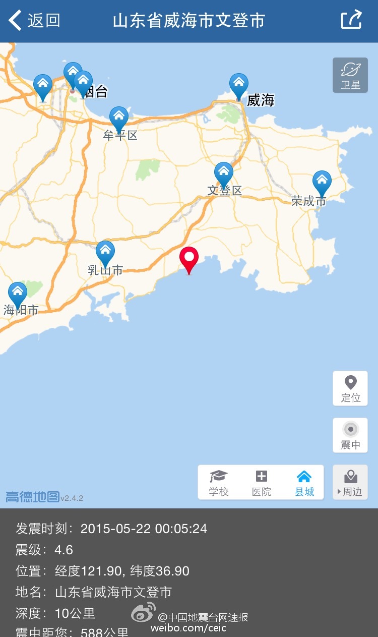 山东威海发生4.6级地震 震源深度10公里