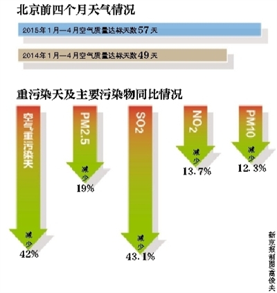 2015年已近半,京城的天儿怎么样?北京市环保局昨日通报,今年前四个月,细颗粒物(PM2.5)同比下降19.0%。空气质量达标天数57天,空气重污染天同比减少42%。