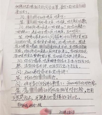 “谁让你吃屎喝尿啊?”“小赐。”“你们这么大的人了,他让你们喝就喝?”“不喝就要挨打,背书写作业就不能通过检查。”“你说你吃屎了,喝尿了,可有人看见?”“全班六个人(除了小赐)都喝了。”