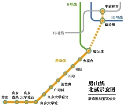 新京报讯 (记者马力)市规划委昨日发布,房山线北延工程近期进行了总体设计方案的专家评审。计划将于2016年开工建设,2019年建设完成。届时,房山线将向北延伸四站,并可换乘10号线、16号线。