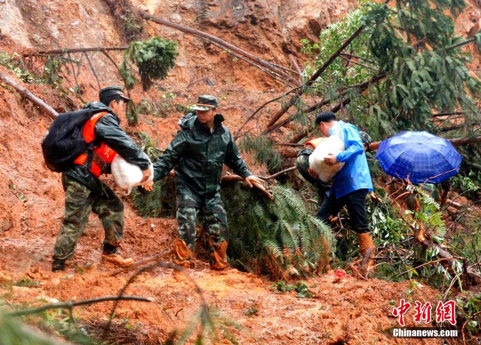5月21日,福建武警三明支队救援小分队赶赴三明市宁化县安乐乡,与当地乡镇干部一起为受灾最严重的村庄三大村3个自然村徒步运送“生命粮”。