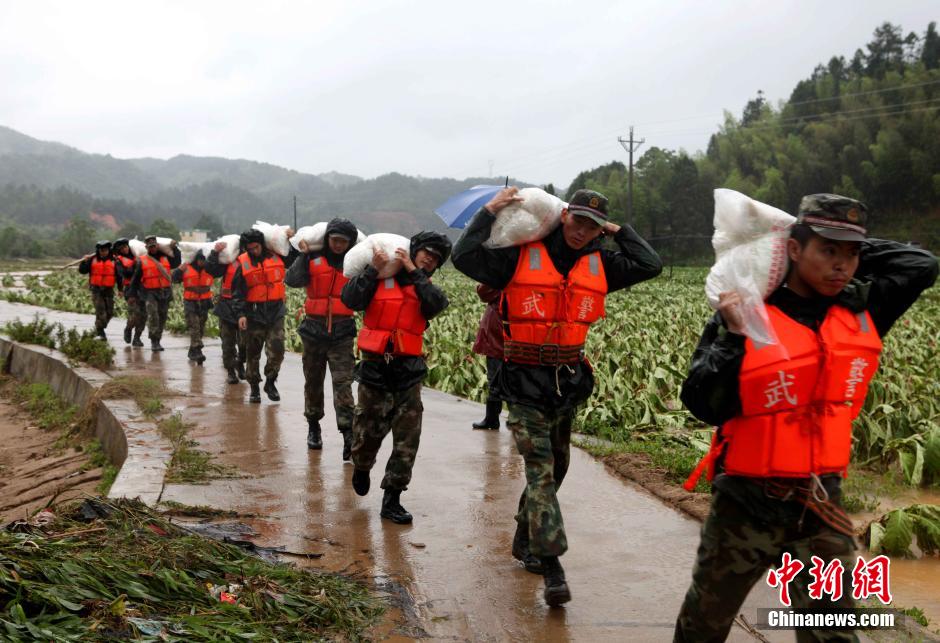 5月21日,福建武警三明支队救援小分队赶赴三明市宁化县安乐乡,与当地乡镇干部一起为受灾最严重的村庄三大村3个自然村徒步运送“生命粮”。