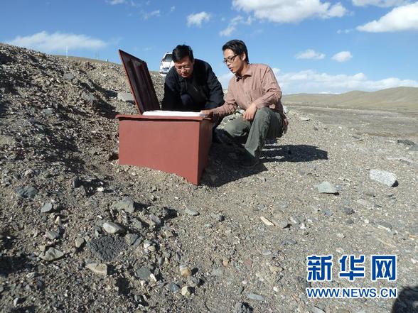 赖远明(左)和同事在青藏公路测量冻土路基地温(资料照片)。 新华社发