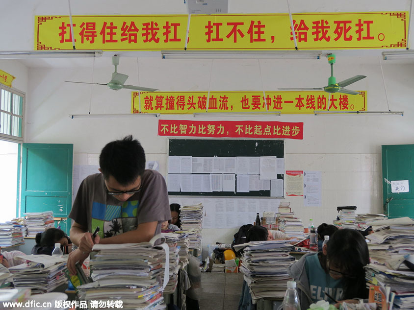 2015年5月21日,广西桂北,高三教室里高悬着一条条“励志”的高考标语,成了一道独特的风景线。