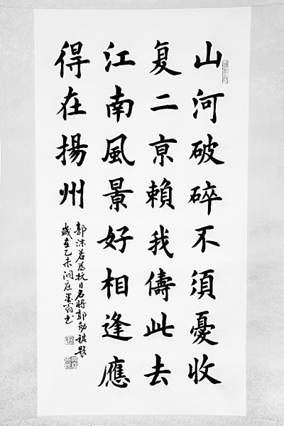 1938年春,我父亲以金村阻击日军之功升为第五十军军长。他伤愈出院时,郭沫若曾为其饯行并赋七绝一首,亲书条幅赠之。诗云:“山河破碎不须忧,收复二京赖我俦。此去江南风景好, 相逢应得在扬州。”
