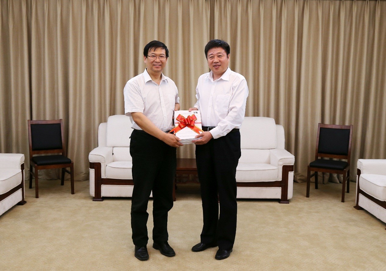 国家铁路局科技与法制司严贺祥司长(左)向中国铁建中非建设有限公司曹保刚董事长(右)赠送英文版铁路技术标准