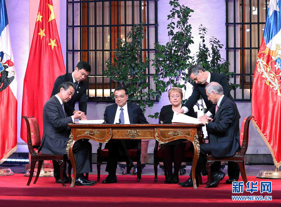 当地时间5月25日,国务院总理李克强在圣地亚哥总统府同智利总统巴切莱特举行会谈后共同出席两国有关文件签字仪式。 新华社记者 刘卫兵 摄