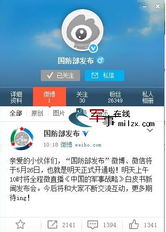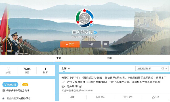记者从国防部新闻事务局获悉,“国防部发布”微博、微信将于5月26日正式开通。国务院新闻办公室将于26日上午10时举行《中国的军事战略》白皮书新闻发布会,届时“国防部发布”微博将全程微直播。