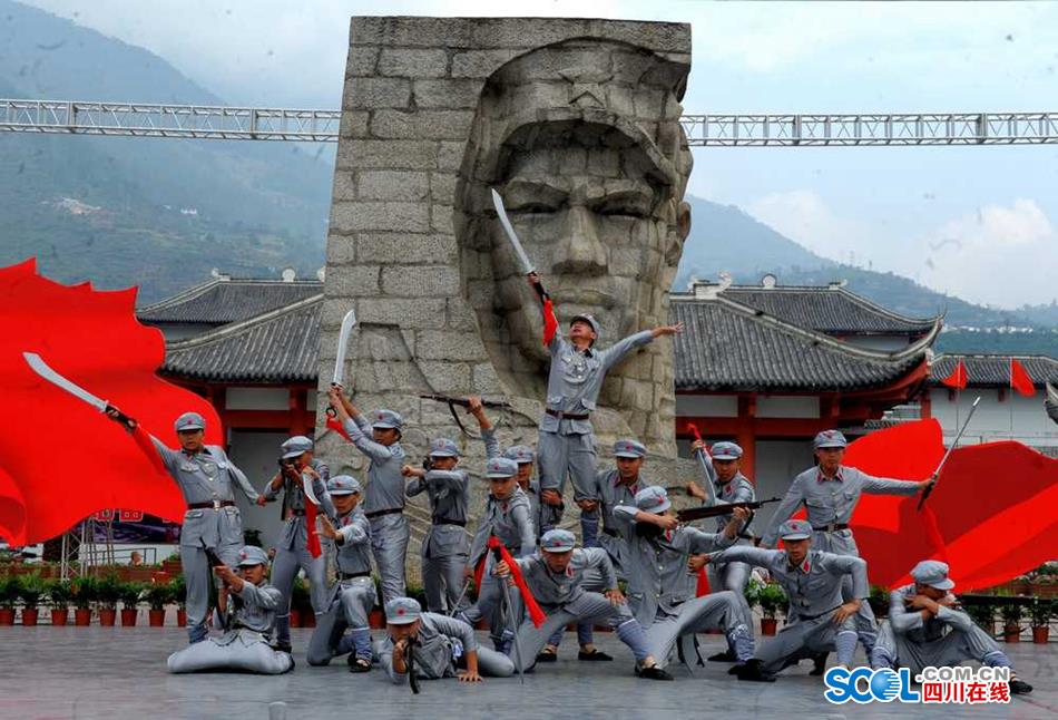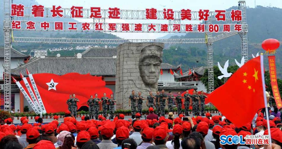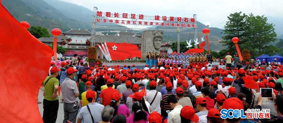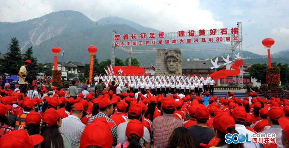 5月25日,纪念中国工农红军长征强渡大渡河胜利80周年文艺演出在石棉县安顺场强渡大渡河纪念碑广场隆重举行。纪念活动以“踏着长征足迹、建设美好石棉”为主题,纪念演出共分为《强渡天堑》、《历史丰碑》、《歌唱祖国》三个篇章。近万名当地群众和红色旅游游客在现场进行了大合唱《没有共产党就没有新中国》、《红军渡》、《红军不怕远征难》、《十送红军》等耳熟能详的红军歌曲。(记者 衡昌辉)