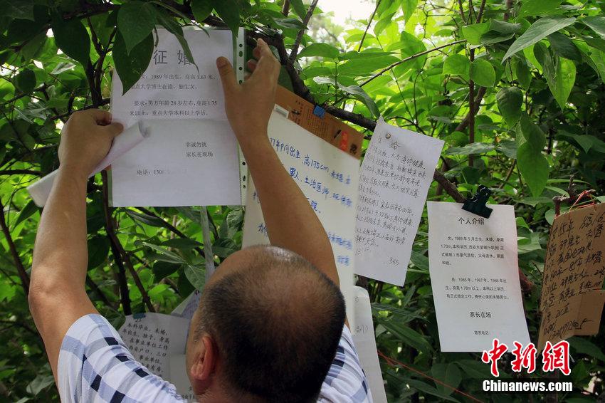 5月24日,陕西省西安市,革命公园相亲角免费的公益相亲活动。由于征婚告示实在太多,替儿女相亲的父母们为了找个醒目的好位置,自发组团轮流挂告示抢位置。来迟的人只好将征婚告示放在地上或者绿化带上。图片来源:CFP视觉中国