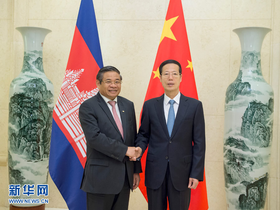 5月26日,中共中央政治局常委、国务院副总理张高丽在重庆会见出席亚欧互联互通产业对话会的柬埔寨副首相因蔡利。 新华社记者王晔摄