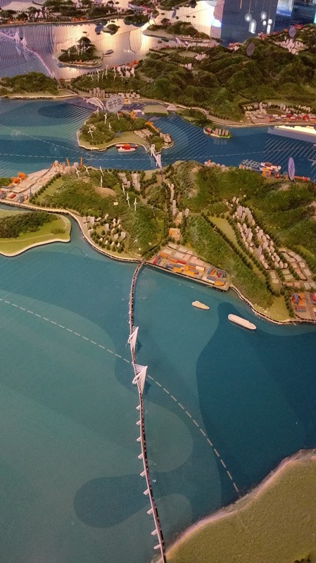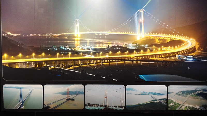 照片和沙盘上,全长50公里的一座座跨海大桥首尾相连,从舟山本岛启程,穿越里钓、富翅、册子、金塘四岛,于宁波镇海登陆,好像一条美丽的丝线将一颗颗海上明珠串联起来。