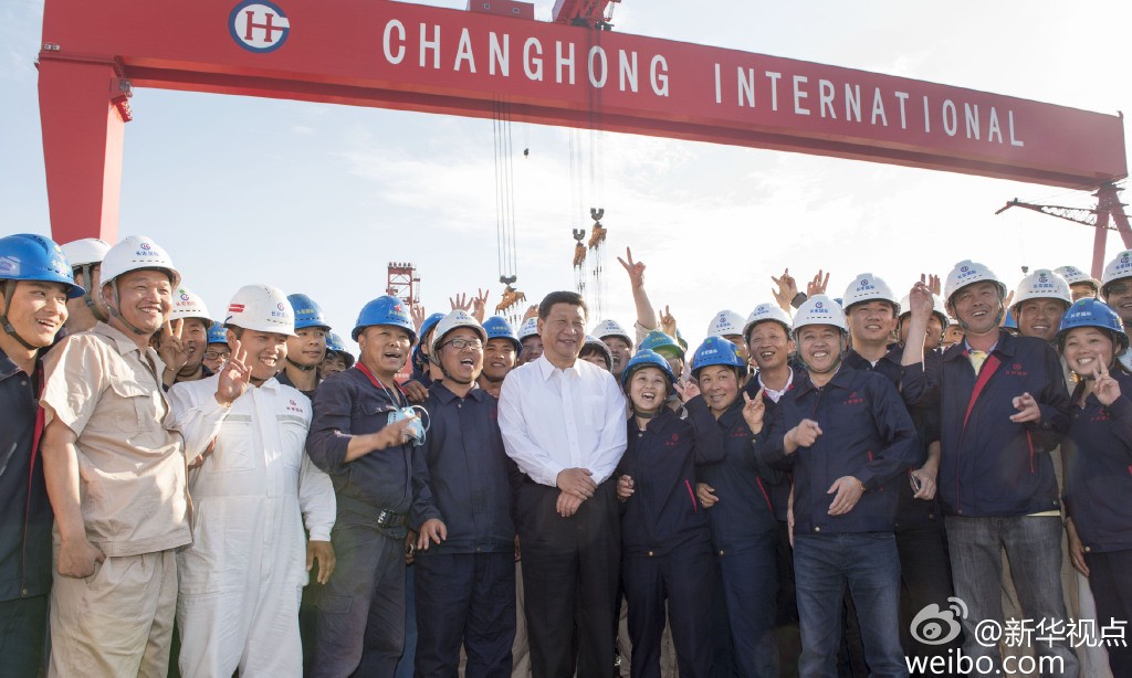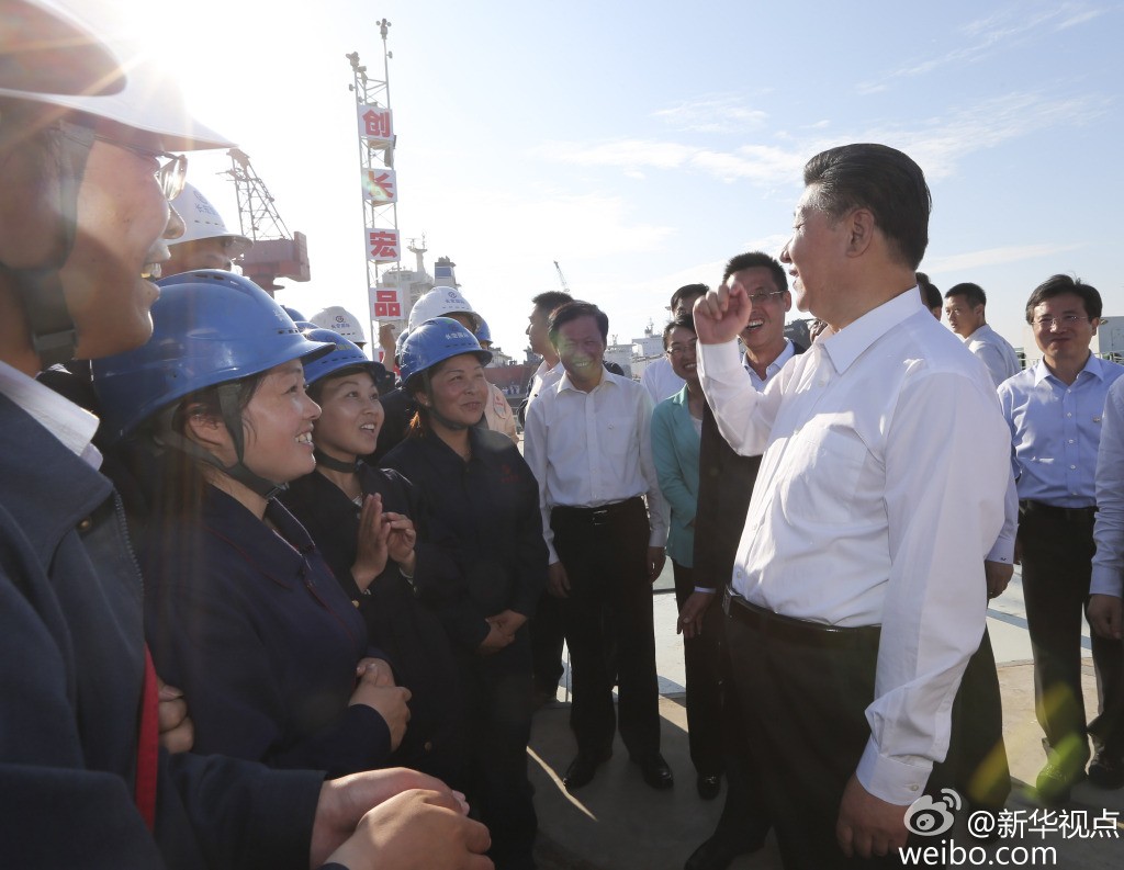 25日下午,习近平来到长宏国际船舶修造有限公司。他登上30万吨级船坞平台,察看造船作业,了解企业生产和科技创新等方面的情况。