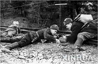 图为游击队员在敌占区埋地雷,破坏德军的铁路运输。