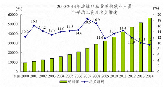 2014年全国城镇非私营单位就业人员年平均工资为56339元,与2013年的51483元相比,增加了4856元,同比名义增长9.4%,增幅回落0.7个百分点。其中,在岗职工年平均工资57346元,同比名义增长9.5%,增幅回落0.6个百分点。扣除物价因素,20147.1%。