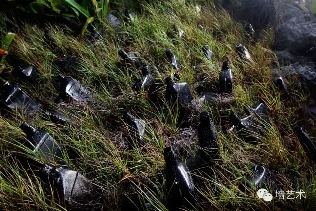 这些塑料瓶子都是Duran捡来的,为了突出视觉效果,他根据周边的环境把不同色彩的瓶子集中到一起,这样一堆一堆的放在一起,艺术家就是在用这些垃圾诉说乱扔现象。