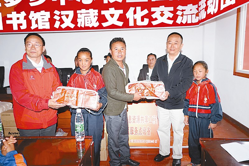 2014年8月6日,四川省图书馆向甘孜州炉霍县上罗科玛乡中心小学校汉藏文化交流服务点图书室赠送第一批图书。图片由四川省图书馆提供