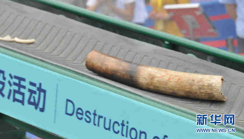 5月29日,中国国家林业局和海关总署在北京市野生动物救护中心联合举行了“中国执法查没象牙销毁活动”,共销毁2014年以来执法机关查没并结案的非法象牙及象牙制品662.43千克。这是粉碎机传送带上的象牙。新华网 刘强 摄
