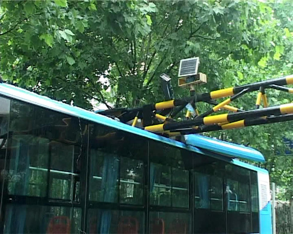 这是一辆江南公交公司的公交车,此时车子的空调排风口撞到了路口上方的限高杆,公交车的空调外机被损坏,而粗大的限高杆也被撞得连根拔起,整辆公交车被卡在那里动弹不得。司机称,他是临时经过此路段,并不太了解路段情况。图为事发现场。