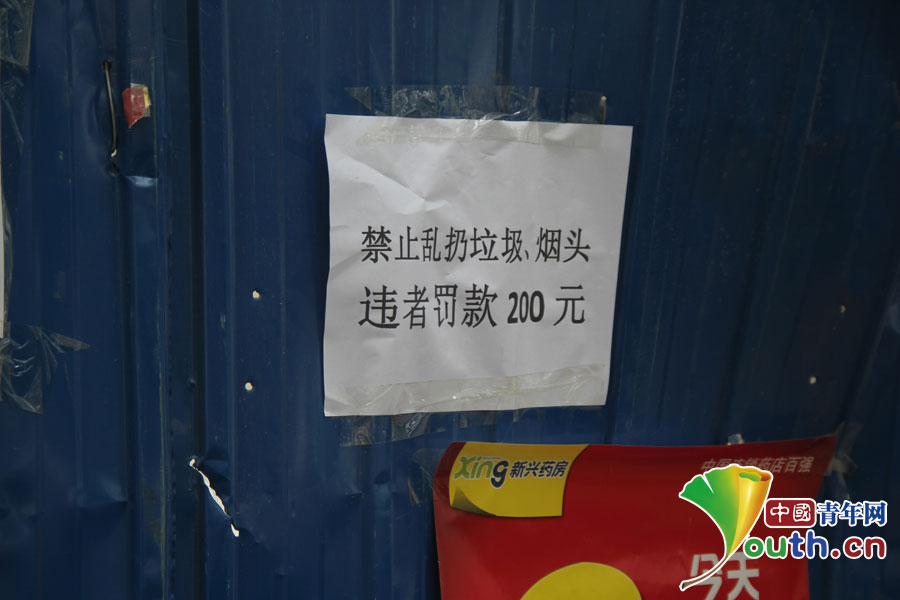 某工地围栏上张贴的禁止乱扔烟头通知。中国青年网记者 孟畅摄