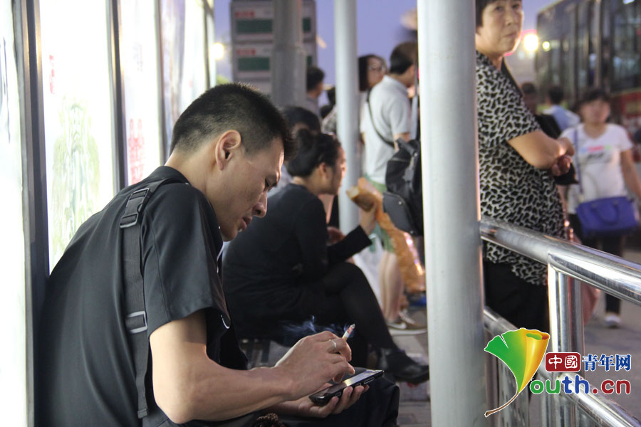 公交车站等车时还不忘记抽一根烟解闷的路人。中国青年网记者 佟亮摄