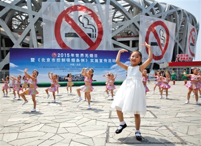 昨日,鸟巢,小朋友们跳起控烟广场舞《无烟小苹果》。当日是第28个世界无烟日,国家卫生计生委等8部门共同主办活动,宣传控烟。新华社记者 沈伯韩 摄