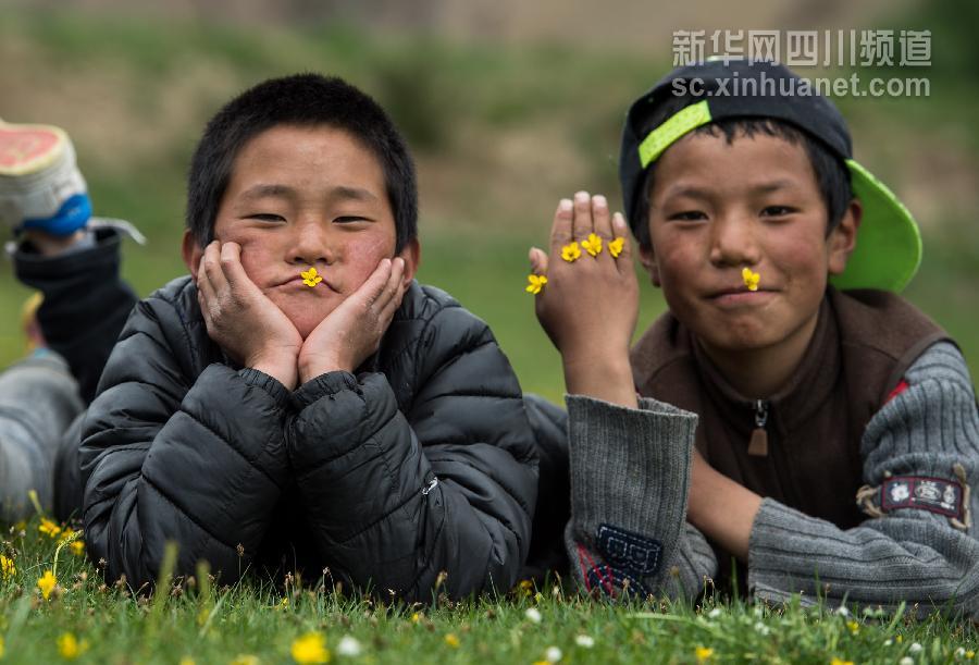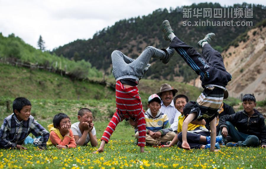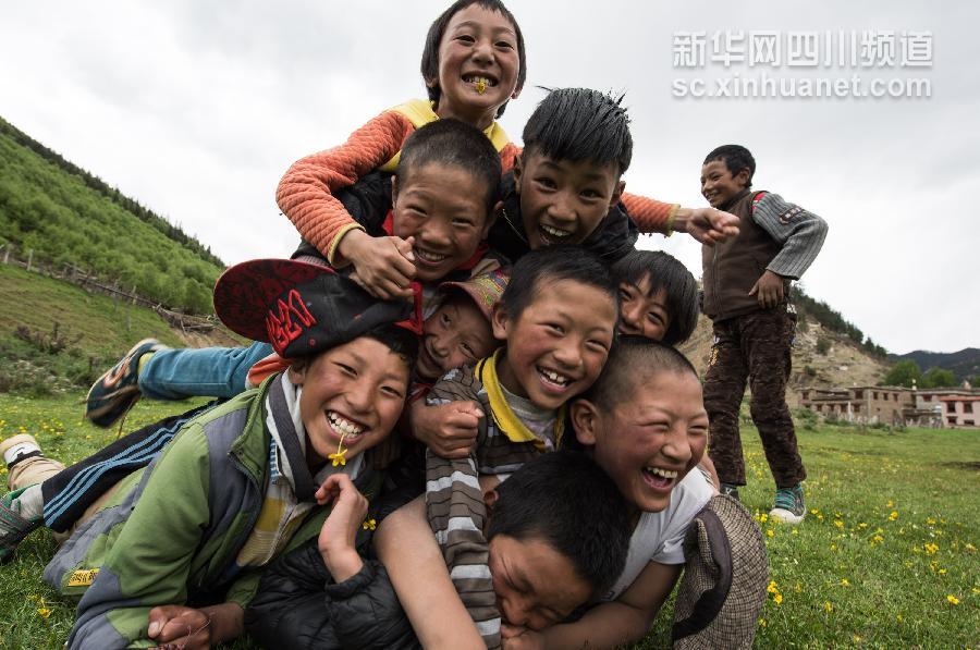 5月31日,在雅江县西俄洛乡康巴汉子村,孩子们在草地上玩耍。