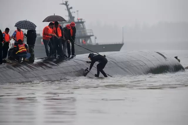 接到报警的海巡艇冒风雨于23:51分救起两人。这两人告知,“东方之星”翻沉了。