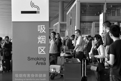 昨天,首都机场T3航站楼出发层和到达层室外分别设有三个和四个吸烟区,地上用黄线围起,吸烟者大多自觉站到黄线内吸烟。 京华时报记者徐晓帆摄