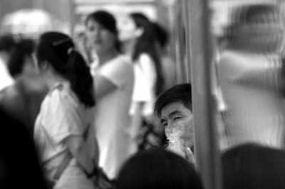 昨天,在三元桥公交站台,一男子在排队等车的人群中吸烟,此举属于违反《北京市控制吸烟条例》的行为。 京华时报记者谭青摄