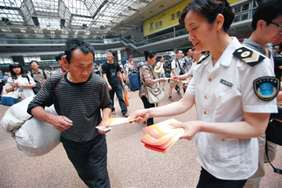 昨日,北京西站,铁路卫生监督工作人员发放控烟宣传手册。新京报记者 王贵彬 摄