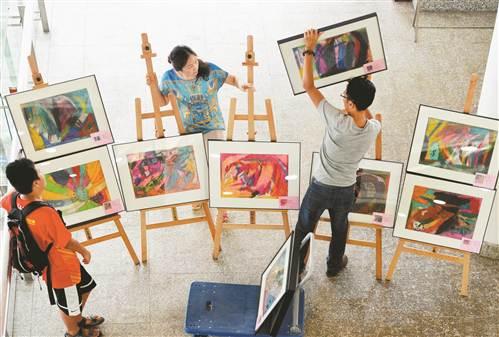 2014年8月5日,在重庆图书馆,轩轩的父母在整理孩子的作品。