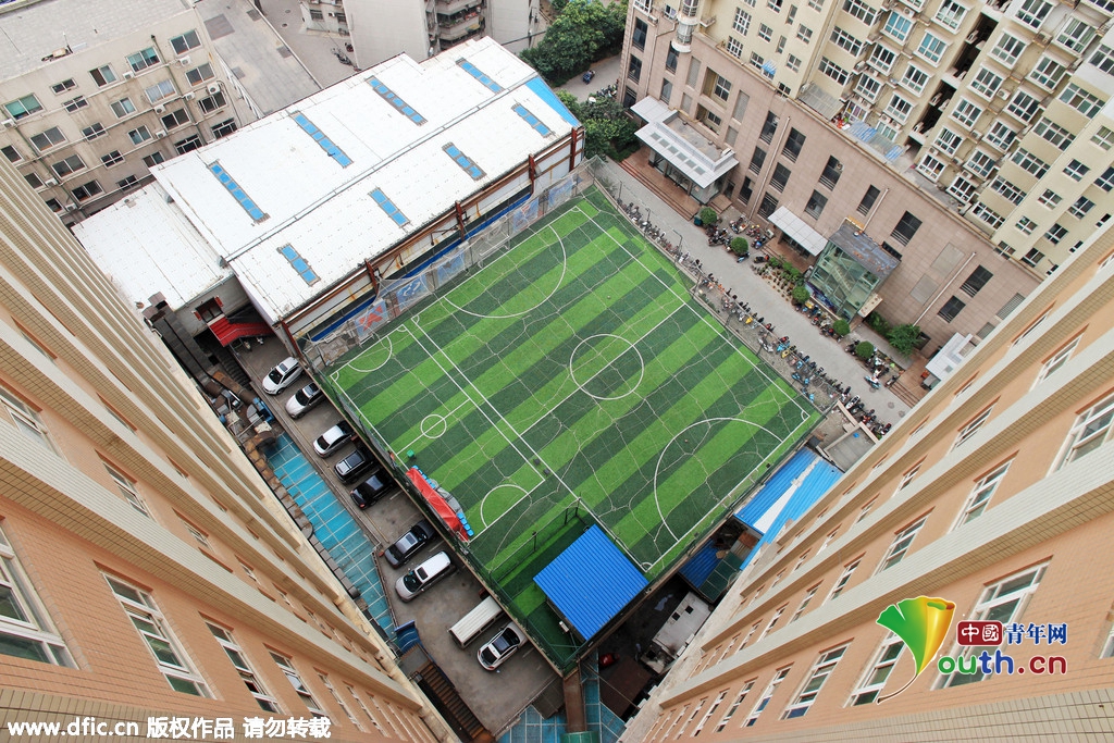 2015年6月3日,河南省郑州市,这个“空中足球场”位于紫荆山路与城北路交叉口处的一座商业楼的二楼平台,为钢筋混凝土“森林”增添了一抹绿色和生机。这个“空中足球场”场地面积约900㎡,是郑州市一位名叫徐聪的足球爱好者和两个小伙伴利用一个废弃的网球场改建的,不图别的,就图自己玩着方便。